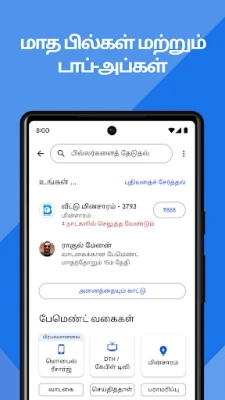 அன்றாடத் தேவைகளுக்கான பில் கட்டணங்கள் இனி ஒரு சிரமமல்ல. Google Pay, DTH, பிராட்பேண்ட், மின்சாரம், FASTag, LPG போன்ற பல்வேறு பில்களை எளிதாகச் செலுத்த உதவுகிறது. ஒருமுறை உங்கள் பில்லர் கணக்குகளை இணைத்துவிட்டால் போதும், சரியான நேரத்தில் பணம் செலுத்த Google Pay உங்களுக்கு நினைவூட்டும். கூடுதல் கட்டணங்கள் இல்லாமல் மொபைல் ப்ரீபெய்ட் ரீசார்ஜ்களை உடனே செய்யுங்கள். ATM செல்லாமல் உங்கள் வங்கிக் கணக்கு இருப்பை எப்போது வேண்டுமானாலும் சரிபார்க்கலாம். கடைகளிலும் வணிக நிறுவனங்களிலும் QR குறியீடுகளை ஸ்கேன் செய்து விரைவாகப் பணம் செலுத்தும் வசதியுடன், Google Pay உங்களின் டிஜிட்டல் வாழ்க்கைக்கான ஒற்றை தீர்வாக அமைகிறது. Zomato, redBus, MakeMyTrip போன்ற கூட்டாளர் தளங்களுடன் இணைந்து உணவு ஆர்டர்கள், பயண முன்பதிவுகள் ஆகியவற்றையும் எளிதாக மேற்கொள்ளலாம்.