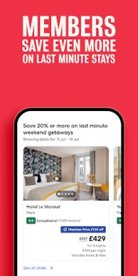 Hotels.com செயலி உங்களின் ஒவ்வொரு பயணத்தையும் எளிமையாக்கி, மறக்க முடியாத அனுபவமாக மாற்ற வந்துள்ளது. உலகெங்கிலும் உள்ள 100,000-க்கும் அதிகமான ஹோட்டல்களில் 10% அல்லது அதற்கு மேற்பட்ட சிறப்பு உறுப்பினர் விலைகளைப் பெறுங்கள்*. எங்கள் One Key™ பயண திட்டத்தில் இணைவதன் மூலம், உடனடிப் பலன்களையும், பல்வேறு சலுகைகளையும் அனுபவிக்கலாம். மேலும், OneKeyCash™*** சம்பாதித்து, உங்கள் அடுத்த பயண முன்பதிவில் உடனடியாகச் சேமிக்க அதைப் பயன்படுத்தலாம். One Key சில்வர், கோல்ட், பிளாட்டினம் உறுப்பினர்களுக்கு, குறிப்பிட்ட VIP அணுகல் ஹோட்டல்களில் கூடுதல் சலுகைகள் காத்திருக்கின்றன.