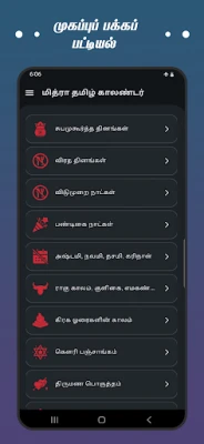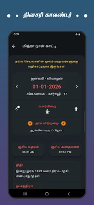 தமிழர் வாழ்வியலின் ஆதாரமான தினசரிப் பஞ்சாங்கம் முதல், நவீன காலத்தின் அத்தியாவசியத் தேவைகளுக்கான கணக்கீட்டுக் கருவிகள் வரை, அனைத்தும் ஒருங்கே அமையப்பெற்ற ஒரு جامع செயலி இது. ஒவ்வொரு நாளும் நல்ல நேரம், ராகு காலம், யமகண்டம், குளிகை, கௌரி நல்ல நேரம் போன்ற காலநேரக் குறிப்புகள், அத்துடன் அன்றைய திதி, நட்சத்திரம், கரணம் மற்றும் அடிப்படை ராசி பலன்கள், சந்திராஷ்டமம் போன்ற விரிவான தகவல்களை இந்தச் செயலியில் எளிதாகக் காணலாம். உங்கள் தினசரிச் செயல்பாடுகளைத் திட்டமிடுவதற்குத் தேவையான அனைத்து ஜாதகக் குறிப்புகளும் இங்கே துல்லியமாக வழங்கப்படுகின்றன.