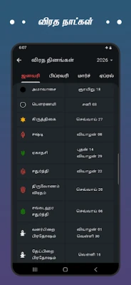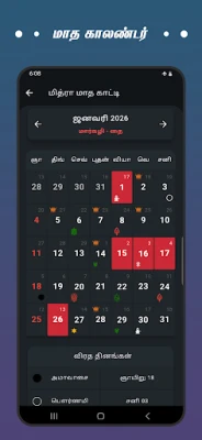 மாதாந்திரக் காலண்டர் பார்வையில், தமிழ் மாதத் தேதிகள், வளர்பிறை மற்றும் தேய்பிறைச் சுப முஹூர்த்த நாட்கள், விரத தினங்கள் மற்றும் அரசு விடுமுறைகள் அனைத்தும் ஒருசேரப் பட்டியலிடப்பட்டுள்ளன. இந்து, கிறிஸ்தவ, இஸ்லாம் ஆகிய அனைத்து மதத்தினரின் திருவிழாக்கள் மற்றும் பண்டிகைகள் வகைப்படுத்தப்பட்டு, விரைவான மற்றும் எளிமையான இடைமுகத்துடன் அணுகும்படி வடிவமைக்கப்பட்டுள்ளது. மேலும், திருமணத்திற்குரிய நட்சத்திரப் பொருத்தத்தை 12 ராசிகளின் அடிப்படையில் சுலபமாக அறியும் வசதியும், அஷ்டமி, நவமி, தசமி, கரி நாள் போன்ற சிறப்புத் தகவல்களும், கௌரி பஞ்சாங்கம், கோரை காலம், தனிஷ்ட பஞ்சமி மற்றும் வாஸ்து சாஸ்திரக் குறிப்புகளும் இதில் உள்ளடங்கியுள்ளன.