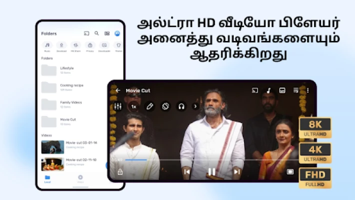 Amazon MX Player-இன் சக்திவாய்ந்த வீடியோ பிளேயர், உங்கள் சாதனத்தின் பல மைய செயலாக்கத் திறனை முழுமையாகப் பயன்படுத்தி, வீடியோ டிகோடிங்கில் வியத்தகு 70% செயல்திறன் மேம்பாட்டை வழங்குகிறது. ஒலியளவைக் கட்டுப்படுத்துவது, திரையின் வெளிச்சத்தை சரிசெய்வது, வீடியோவில் குறிப்பிட்ட இடத்திற்கு செல்வது, ஜூம் செய்வது போன்ற அனைத்து செயல்பாடுகளையும் எளிய சைகைகள் மூலம் நீங்கள் எளிதாக நிர்வகிக்கலாம். வேலைகளுக்கு இடையிலும் தடையின்றி வீடியோக்களைக் காண, தனிப்பயனாக்கக்கூடிய மிதக்கும் சாளரம் மற்றும் பிக்சர்-இன்-பிக்சர் (PiP) வசதியை Amazon MX Player கொண்டுள்ளது. உங்கள் விருப்பத்திற்கு ஏற்ப இடைமுகம் மற்றும் பிளேபேக் கட்டுப்பாடுகளை மாற்றி, உங்களின் அனுபவத்தை முழுமையாக்கிக் கொள்ளுங்கள். மேலும், விரிவான வசன ஆதரவும் இதில் ஒருங்கிணைக்கப்பட்டுள்ளது.