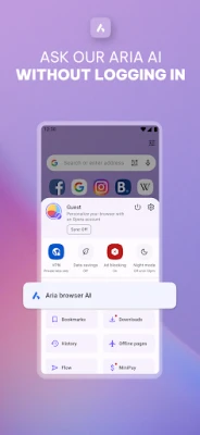 Opera உங்களுக்காகவே உருவாக்கப்பட்ட ஒரு தனிப்பட்ட உலாவியாகும். Aria என்னும் உள்ளமைக்கப்பட்ட AI துணை மூலம், ஒரு நண்பருடன் அரட்டை அடிப்பது போல் கேள்விகளைக் கேட்டு பதில்களைப் பெறலாம். இது இணையத்துடன் இணைக்கப்பட்ட இலவச அம்சமாகும். Flow வசதியைப் பயன்படுத்தி, உங்கள் கோப்புகள் மற்றும் இணைப்புகளை அனைத்து Flow-செயல்படுத்தப்பட்ட சாதனங்களிலும் உடனடியாகப் பகிரலாம், திரைகளுக்கிடையே தடையின்றி மாறலாம். Opera-வின் சுருக்க தொழில்நுட்பத்தால் இயக்கப்படும் தரவு சேமிப்பு முறை, அதிவேக இணையத்தையும், மென்மையான பக்க ஏற்றத்தையும் உறுதிசெய்து, உங்கள் பேட்டரி ஆயுளையும் சேமிக்கிறது. வாசிப்பு விருப்பத்தேர்வுகள், பின்னணி வால்பேப்பர், பிடித்தமான தேடுபொறி மற்றும் இரவுப் பயன்முறையில் கண் பாதுகாப்பு என பல வழிகளில் உங்கள் உலாவியைத் தனிப்பயனாக்கலாம்.