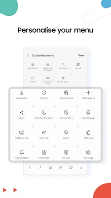சாம்சங் இன்டர்நெட், வீடியோ அசிஸ்டென்ட், டார்க் மோட், தனிப்பயனாக்க மெனு மற்றும் மொழிபெயர்ப்பாளர் போன்ற பயனுள்ள நீட்டிப்புகளுடன் இணைய உலாவலுக்கு சிறந்த அனுபவத்தை வழங்குகிறது. சீக்ரெட் மோட், ஸ்மார்ட் ஆன்டி-டிராக்கிங் மற்றும் ஸ்மார்ட் பாதுகாப்பு அம்சங்களுடன் உங்கள் தனியுரிமையைப் பாதுகாக்கிறது.